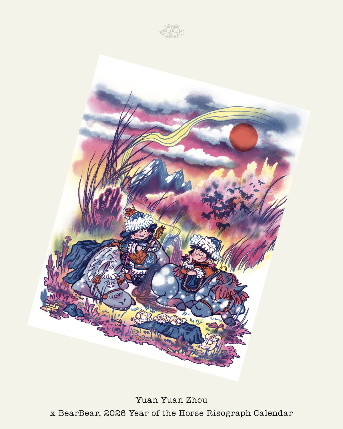 “Year of the Horse” asks us to confront in full risograph glory the enchanting creature that is: The Horse. In BearBear's third year of commissioning local + Midwestern artists to contribute original illustrations to a bespoke calendar, this year is a celebration of all things equestrian. This is a handmade, brightly colored, hyper-unique gift that brightens any wall, cubicle, or horse stall.
