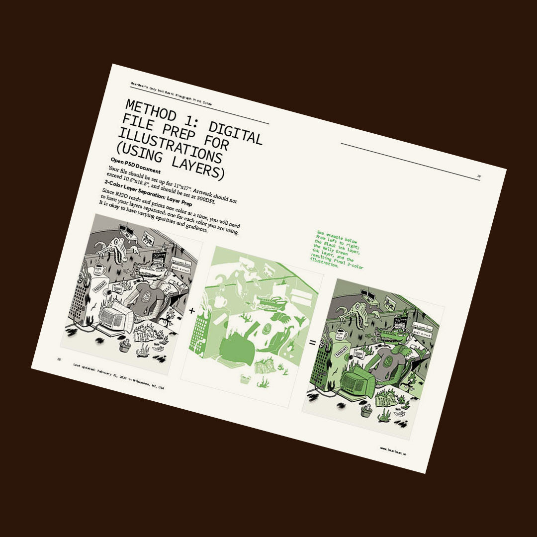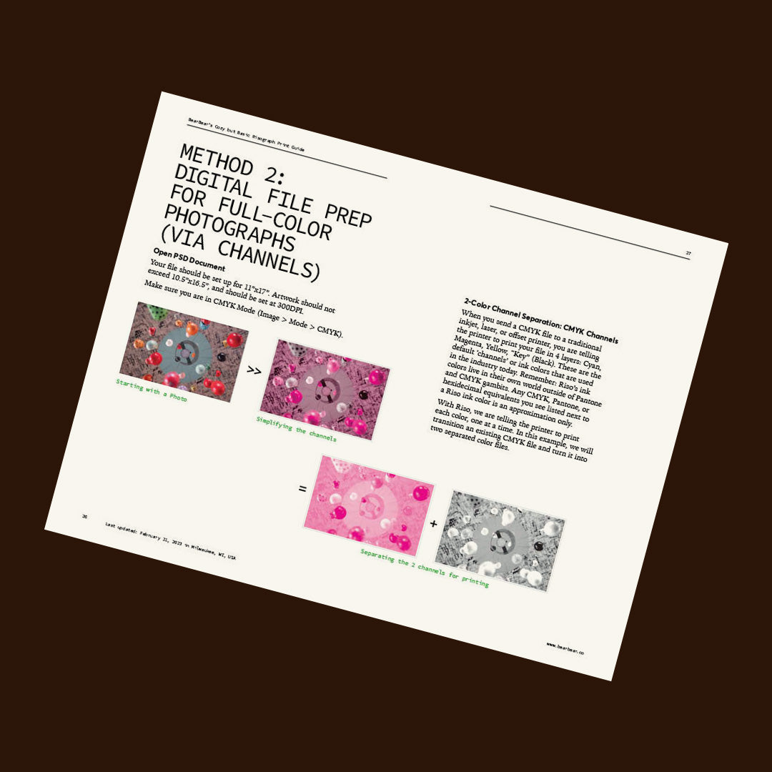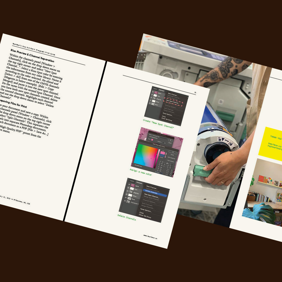 This mini guide is a basic tool that overviews using the scanning bed, paper settings, Riso's quirky idiosyncrasies, and goes over two ways to separate a full-color file in Adobe Photoshop: using Layers or Channel Separation methods. There's a little section on choosing paper, the differences in bitmap settings, and additional helpful resources :-) Enjoy.
