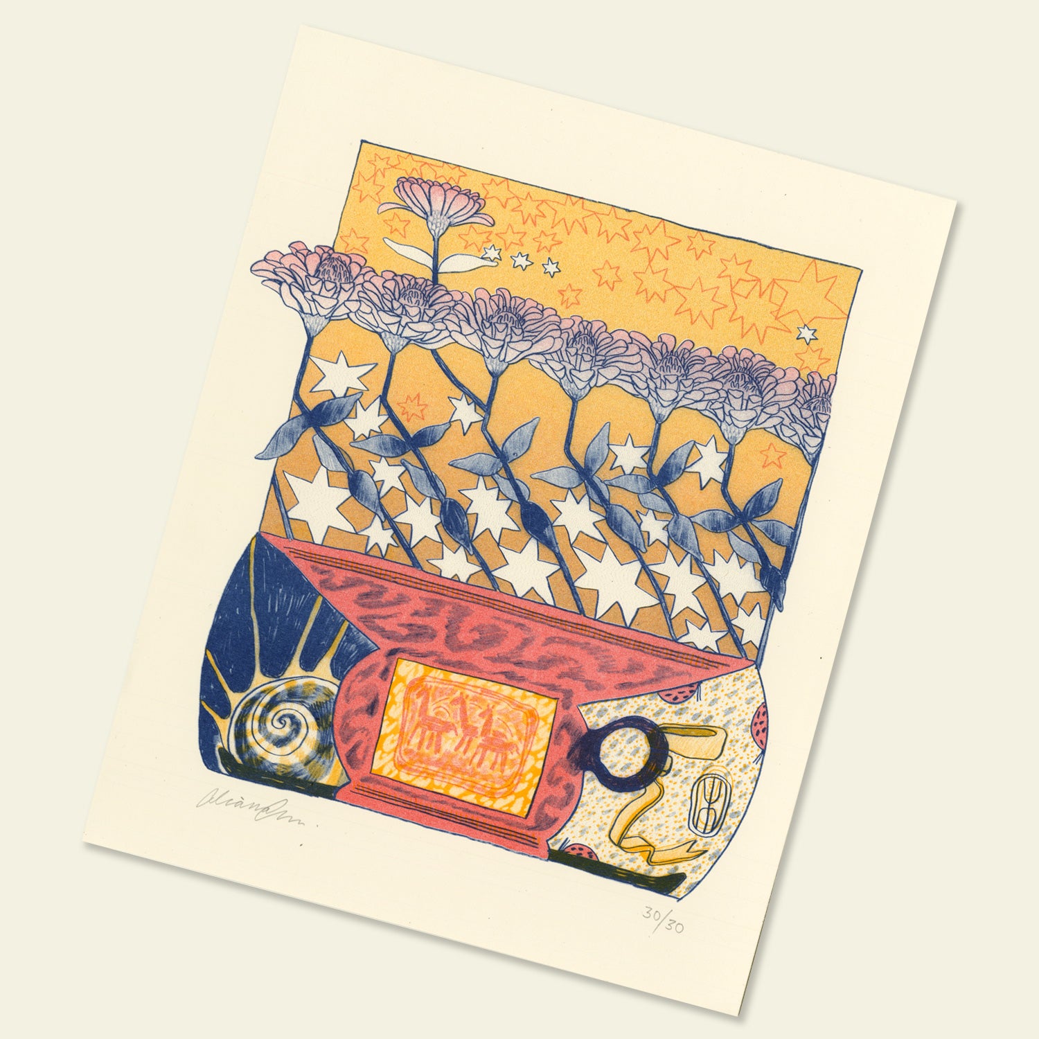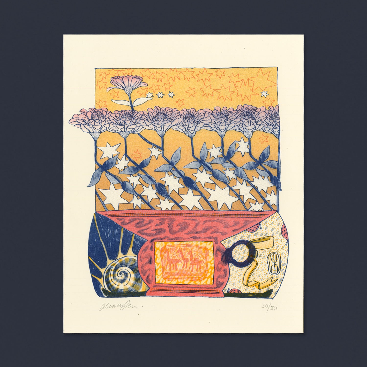 Ancient Vase is a color-pencil drawing on Duralar, translated into three riso ink colors by Diana H. Chu. This bespoke print is perfect for your bedroom, hallway, or as a special gift to a loved one. No two are alike. Made in USA.