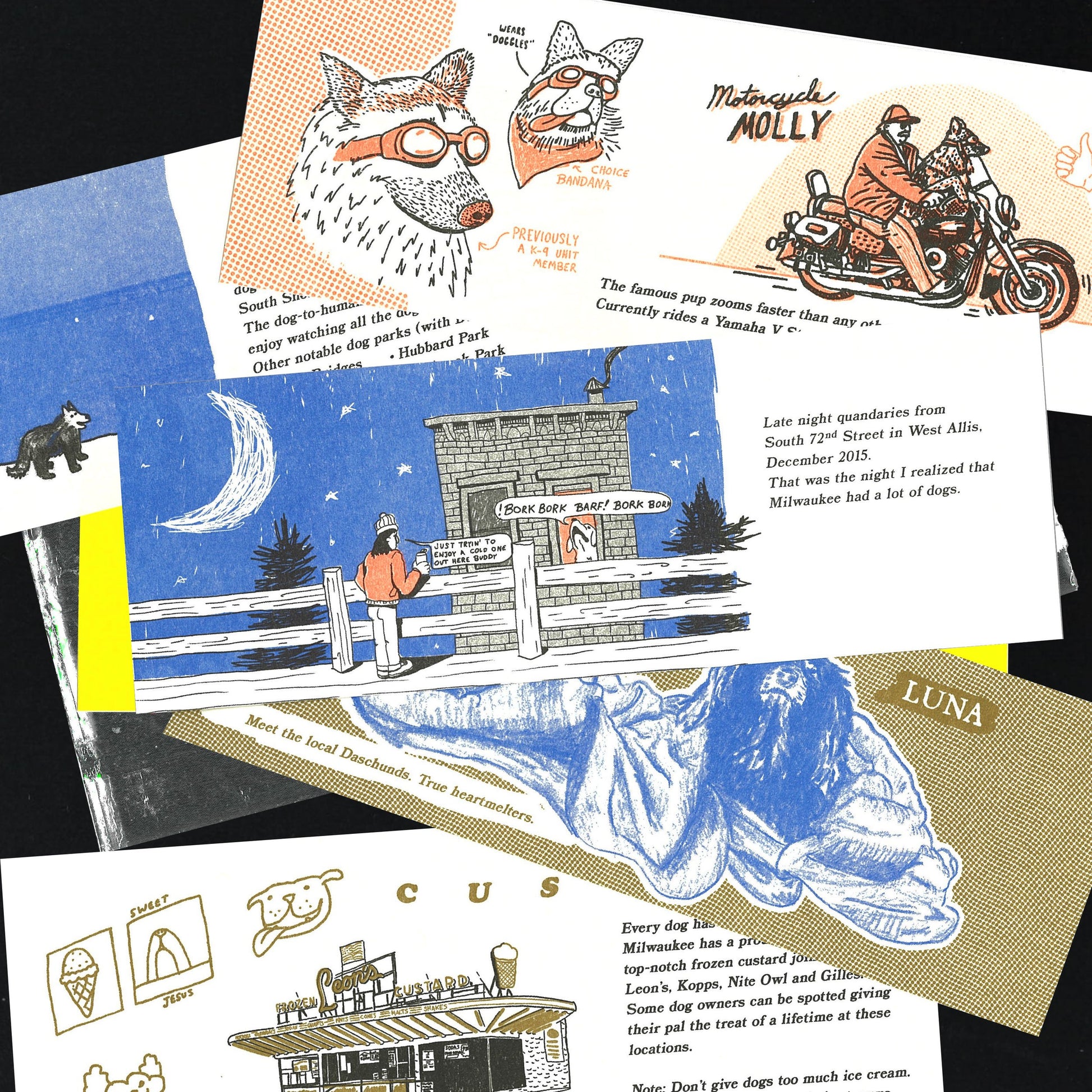 Hot Dog is a wholesome ode to the dogs of Milwaukee in their many edible and non-edible forms. It features slice-of-life musings, drawings and photographs on unbound pages that act like flash cards. The zine evokes the feeling of flipping through printed photographs after a vacation: the best nostalgia! Documentary-style, whimsical, and a delight to share.