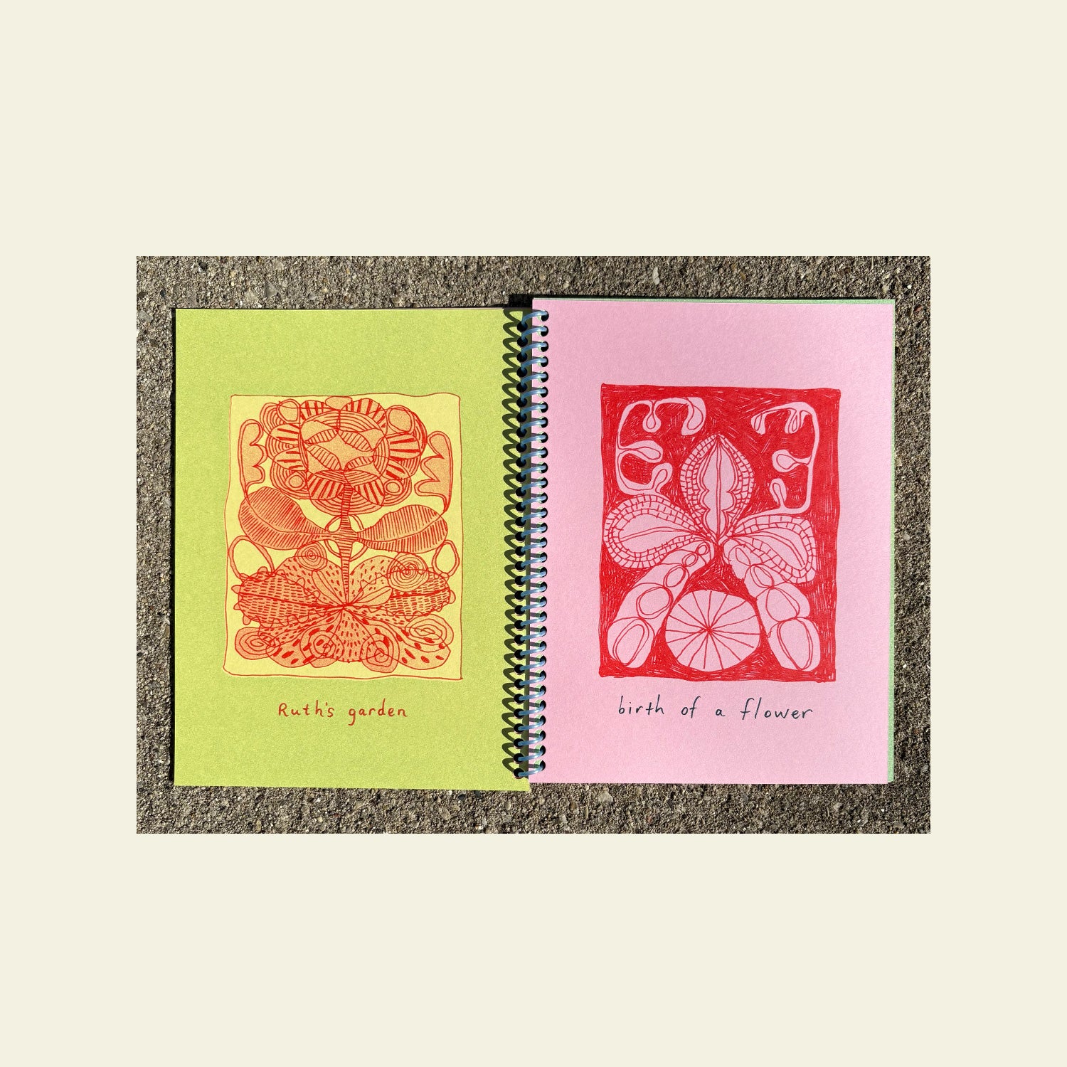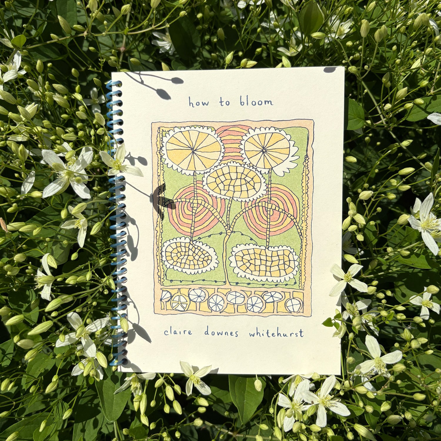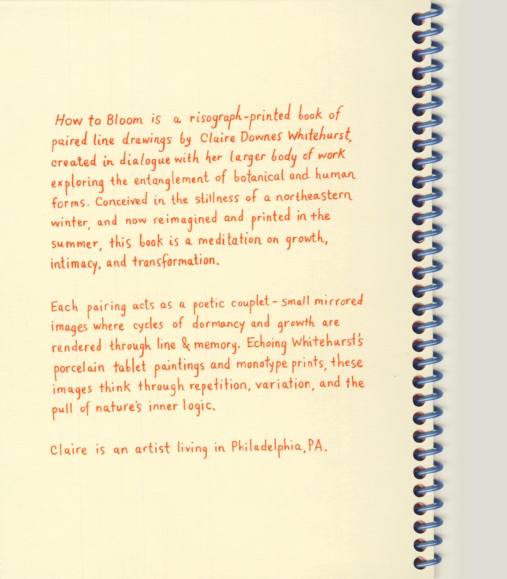 How to Bloom in both its inception and its new iteration, is an art book that investigates growth and transformation: how to bloom through something, how plants form, how time moves, how people move, and how to navigate a life in an imperfect world. It features thirty drawings that appeared first as part of Claire's exhibition with the Schuylkill Center for Environmental Education in February 2025.