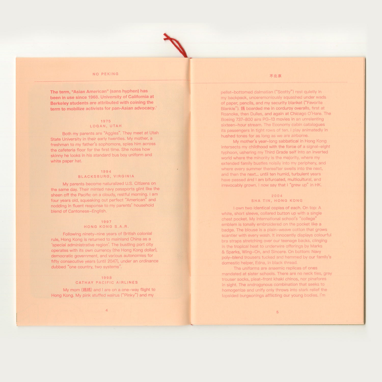 “No Pe-king” is a pun on "peeking" and "Peking", an old spelling and pronunciation of Beijing, the capital of China. Written and illustrated from a personal Asian American perspective, Diana's insights go even deeper from having lived in Hong Kong for ten years during her teens. This is a two-color Risographed zine that investigates memory, belonging, and censorship of Hong Kong's post-British democracy under Chinese communist rule.