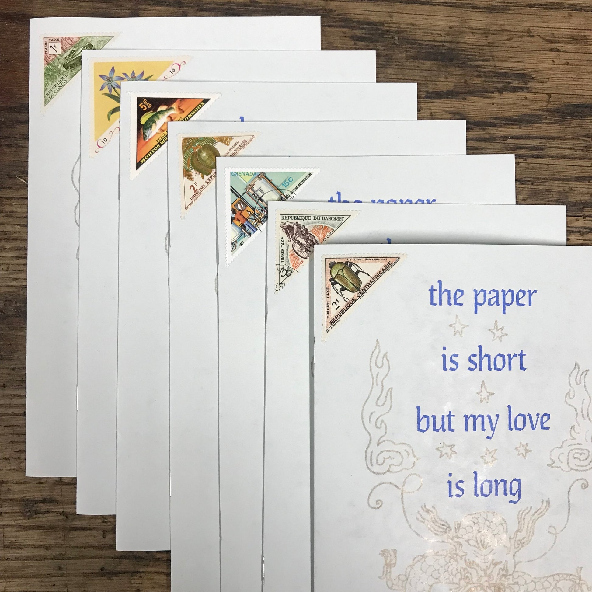 “The Paper is Short but My Love is Long”: Diana’s grandfather, Tse Ting Lung, used to sign off with those words in his letters from sea. This is a two-color Risographed zine written and illustrated by Diana Chu and her mother, Eliza Tse. Each zine features unique postal stamps — no two are the same.